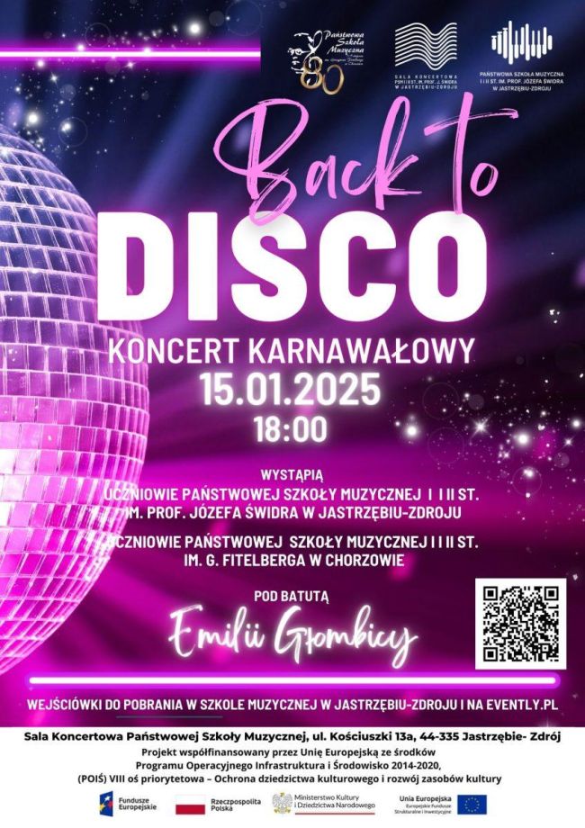 Zapraszamy na koncert Back to Disco w wykonaniu orkiestr uczniowskich Szkół Muzycznych z Jastrzębia-Zdroju i Chorzowa pod batutą Emilii Głombicy.