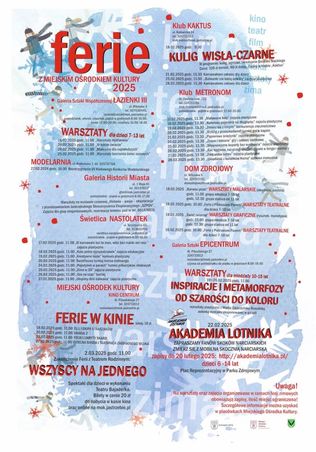 Zapraszamy na zajęcia organizowane przez Miejski Ośrodek Kultury w Jastrzębiu-Zdroju w czasie ferii zimowych w 2025 r.!