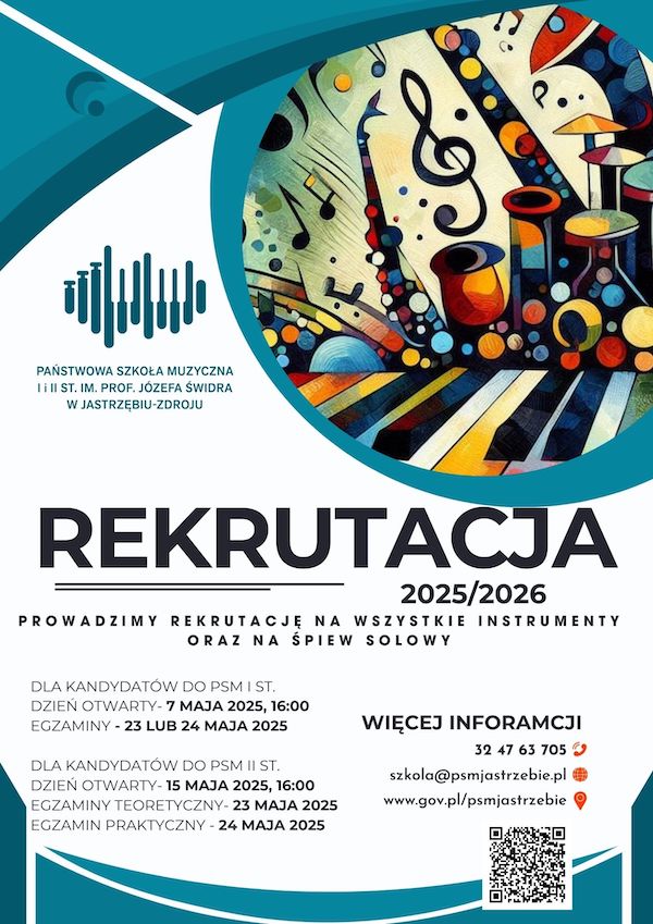Marzysz o tym, aby Twoje dziecko nauczyło się grać na instrumencie, rozwinęło słuch muzyczny i odkryło w sobie pasję do sztuki? To idealny moment, by rozpocząć tę drogę – Państwowa Szkoła Muzyczna I stopnia im. prof. Józefa Świdra w Jastrzębiu-Zdroju ogłasza nabór na rok szkolny 2025/2026!