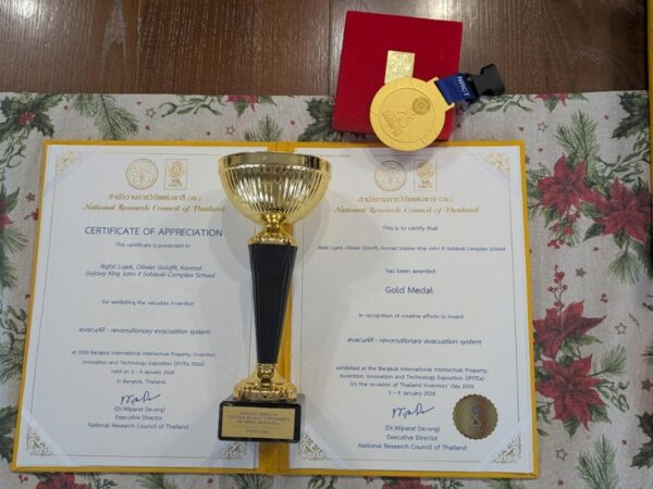 Jeszcze niedawno wspominali dramatyczne okoliczności przerwanej podróży do Indii, gdy z przyczyn niezależnych od nich uczniowie „Sobieskiego” nie dotarli na konkurs (czyt. Sukces mimo przeszkód. Projekty uczniów ZS6 nagrodzone w Indiach). Dziś mogą mówić o triumfie – i to podwójnym. Projekty „Evacuar” i „AgricUp” zdobyły złote medale na Międzynarodowym Konkursie Innowacji IPITEX w Bangkoku w styczniu 2026 r., a wcześniej – bez udziału zespołu – także w Macao w grudniu 2025 r.