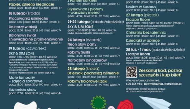 Na ferie zaprasza również Muzeum Miejskie w Jastrzębiu-Zdroju, które przygotowało warsztaty tematyczne, zajęcia edukacyjne oraz spotkania przybliżające historię miasta i regionu. To propozycja dla młodych odkrywców, którzy chcą połączyć zabawę z poznawaniem przeszłości.