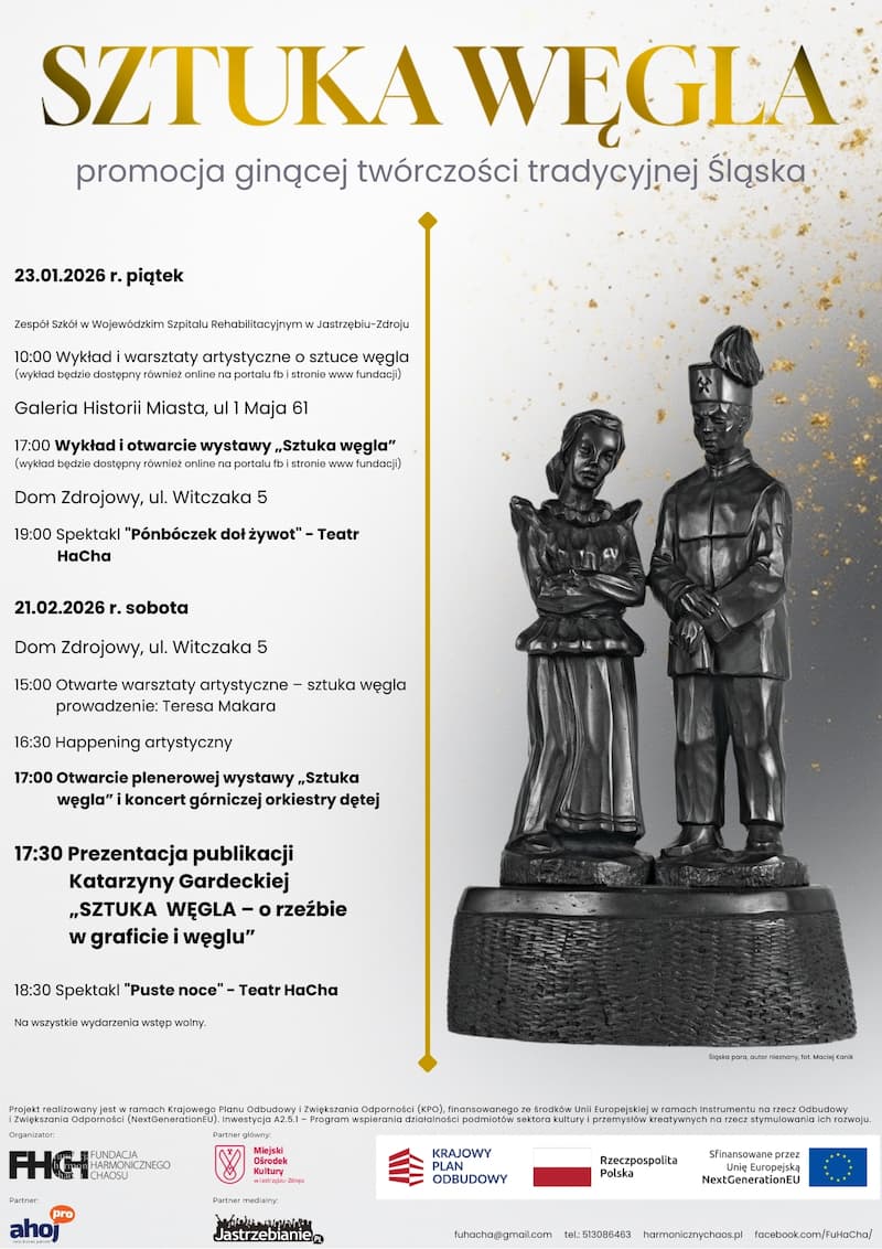 Po styczniowej inauguracji wystawy rzeźb w węglu i graficie projekt „Sztuka Węgla” wkracza w kolejną fazę. Już 21 lutego przed Domem Zdrojowym i w jego wnętrzach odbędzie się druga odsłona wydarzenia, łącząca warsztaty artystyczne, happening, wystawę plenerową, koncert górniczej orkiestry dętej oraz spektakl teatralny. To wyjątkowa okazja, by na nowo odkryć jedną z najbardziej unikatowych i symbolicznych tradycji artystycznych Górnego Śląska.