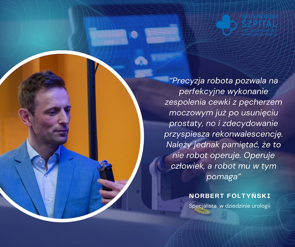 „To był standardowy zabieg robotyczny. Pacjentem był chory z rakiem stercza (70 l.), ze zmianą w obu płatach stercza przytorebkowo, z chorobą ograniczoną tylko do gruczołu krokowego, co potwierdziły wcześniejsze badania obrazowe. Podczas zabiegu usunęliśmy gruczoł krokowy i lokalne węzły chłonne. Dzięki precyzji robota zredukowaliśmy ryzyko nietrzymania moczu u tego pacjenta. Precyzja robota pozwala na perfekcyjne wykonanie zespolenia cewki z pęcherzem moczowym już po usunięciu prostaty, no i zdecydowanie przyspiesza rekonwalescencję. Należy jednak pamiętać, że to nie robot operuje. Operuje człowiek, a robot mu w tym pomaga”